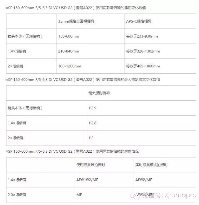 腾龙正式发布SP 150-600mm F/5-6.3 Di VC USD G2和两枚增倍镜。新的SP150-600mm增强了近摄能力,最近对焦距离从2.7m缩短到2.2米,最大放大倍率从1:5.1提升到1:3.9;改进了光学设计;最高4.5档防抖,三种模式可选;新加入了伸缩式变焦锁定装置,提高拍摄时的便捷性;尼康口现在改成电磁光圈,光圈叶片由镜头内置马达通过脉冲信号驱动和控制,从而实现更精确的曝光。;全新开发的脚架接环轻便易握持,可对应阿卡云台(Arca-Swiss)快接板;兼容腾龙多功能调焦器TAP-in ConsoleTM。两款增倍镜支持腾龙自家的VC防抖技术、防尘防滴构造。